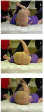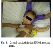 Legenda: Avaliação da flexão lateral cervical passiva (PROM) em bebês com torcicolo congênito, utilizada para monitorar a evolução clínica.